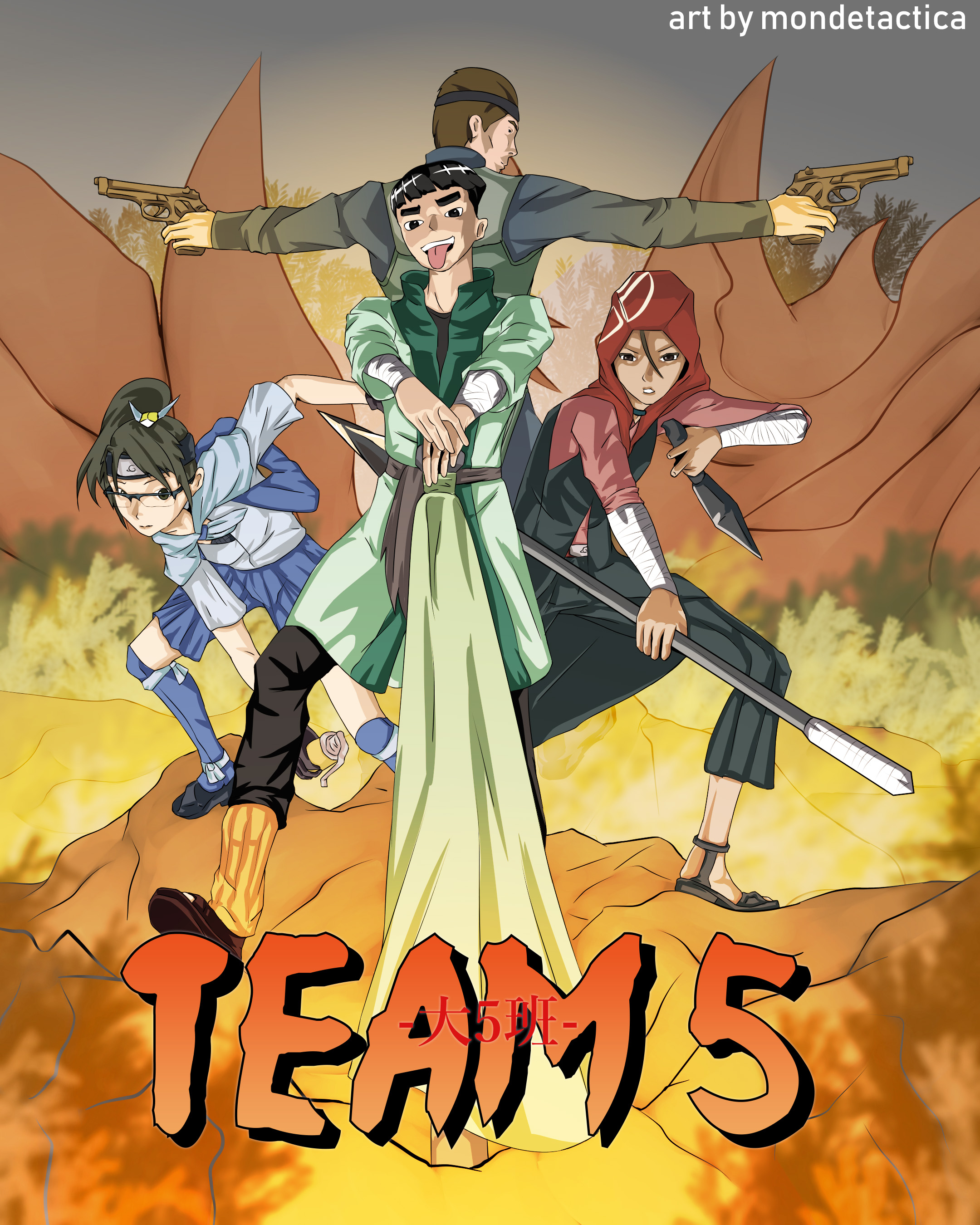 I really enjoy each and every one of these in this feature, secret-gloria has done brilliantly with the characters and the backgrounds behind each team look perfect for each group. The characters are set off very nicely with the colors they are in front of--especially Sai Yamanka's and Udon Ise's teams.