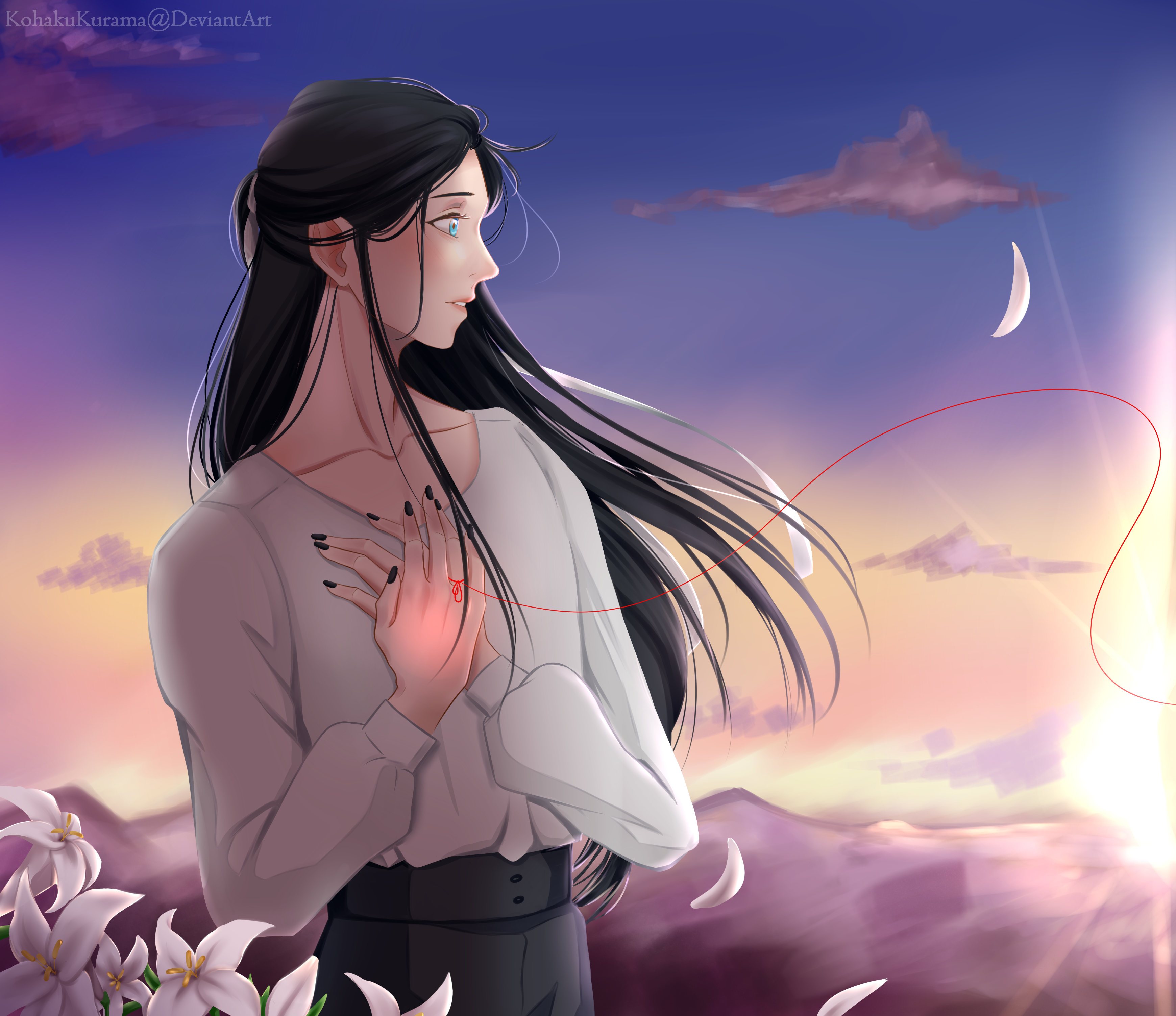 This is yet another character that I know nothing about, but KohakuKurama says the name is Kiiro. They write a very interesting paragraph in the Artist's comments that I like to imagine as the character's thoughts. I wonder who this strand of string is attached to? The artist mentions that this piece is inspired by a song that they link to.