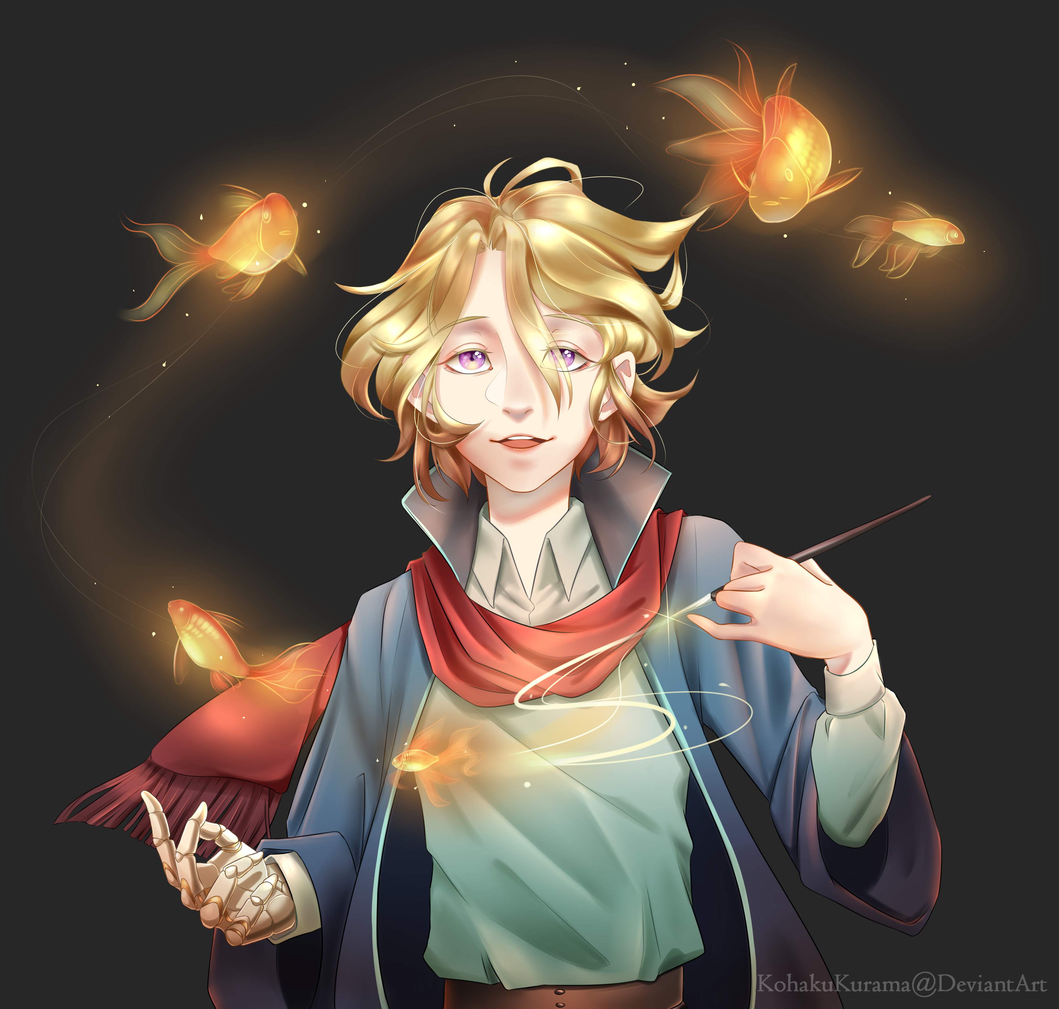 The color of the magic coming from this magic paintbrush is beautiful and I so enjoy how well it lights up the character's hair and clothing! It brings forward the folds and helps bring attention up to his face, after tearing attention from the so well painted goldfish.